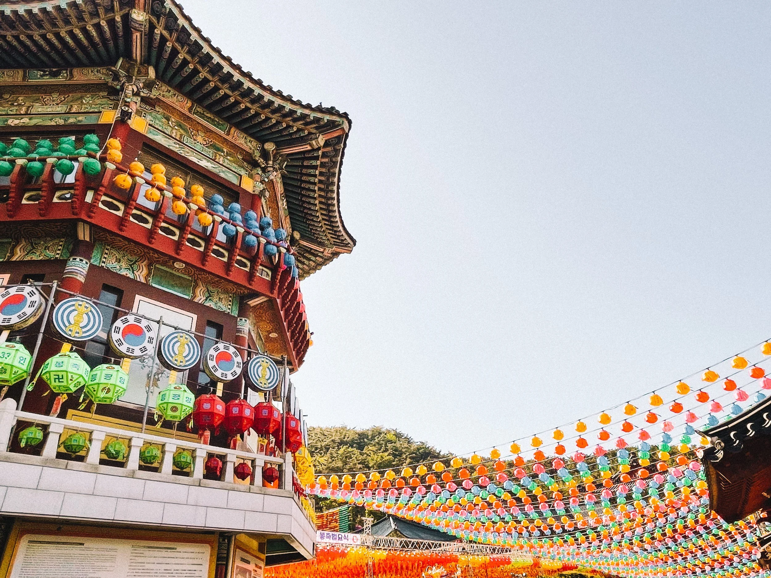 Spring is by far the best time to visit South Korea, because as the cherry blossoms begin to fall off the trees, paper lanterns begin to be put up all over the city in celebration of Buddha’s birthday. The Buddhist temples really pop off, and they put up scaffolding that lets them absolutely cover any open area with a ceiling of brightly colored lanterns.