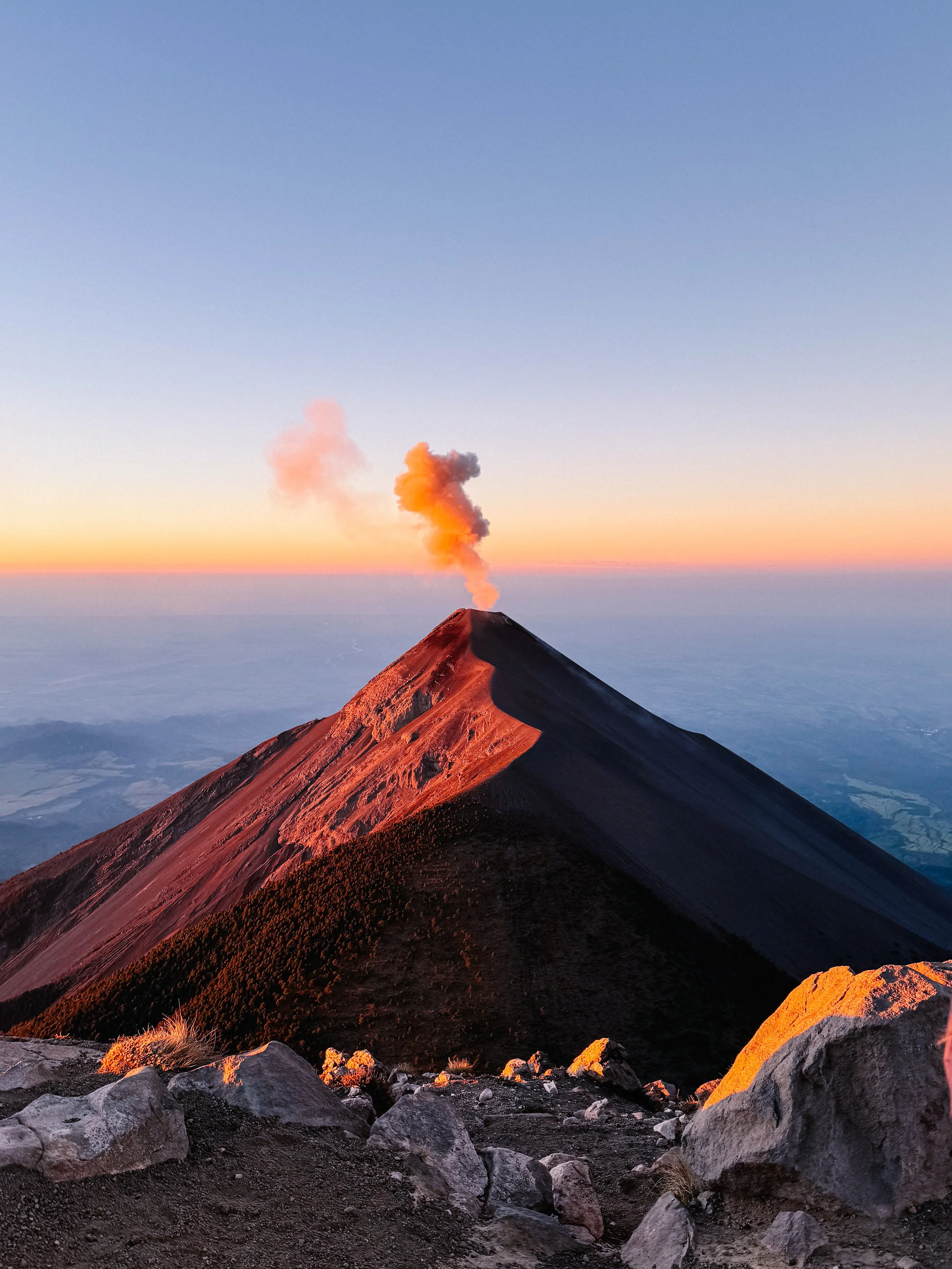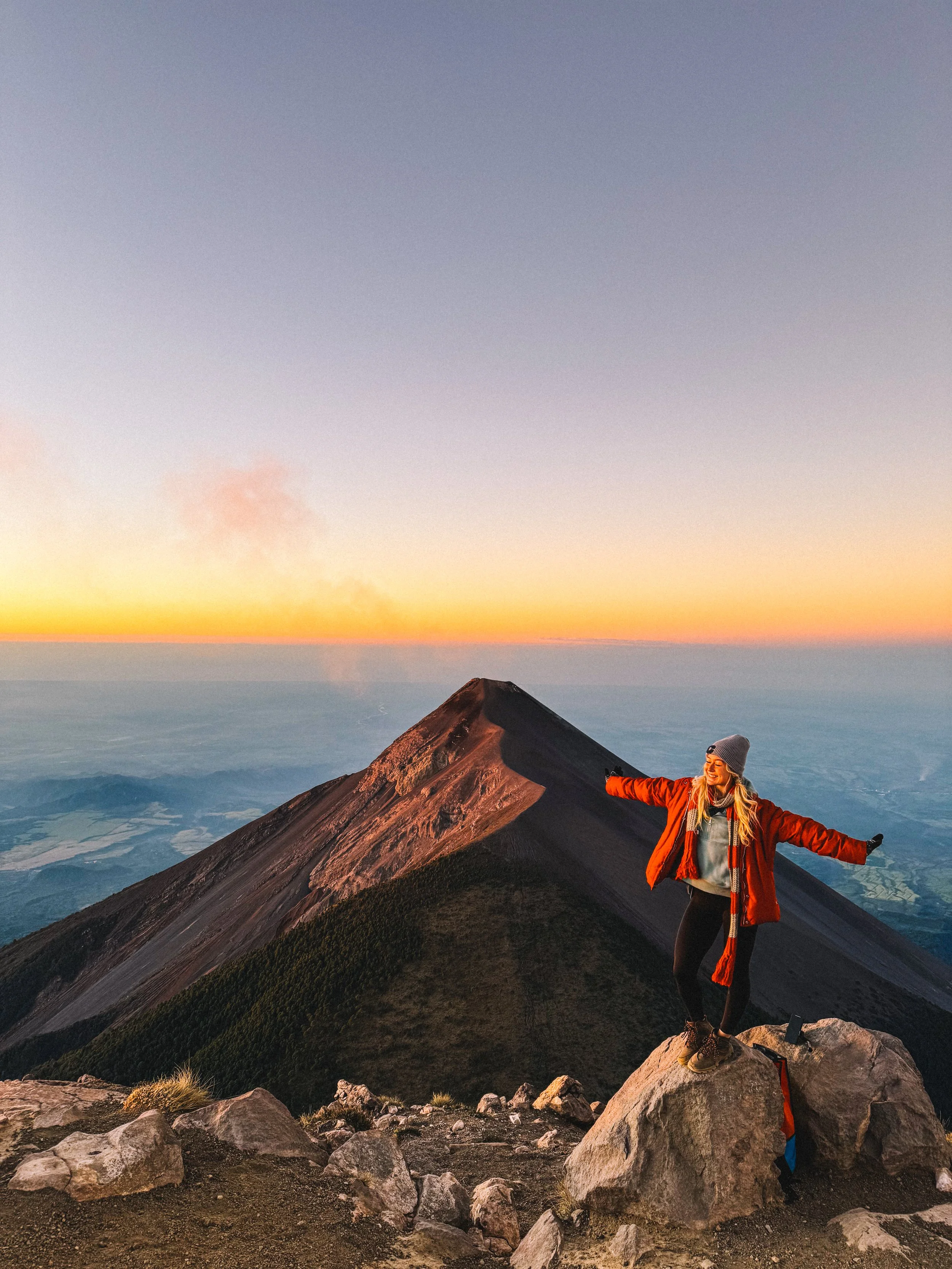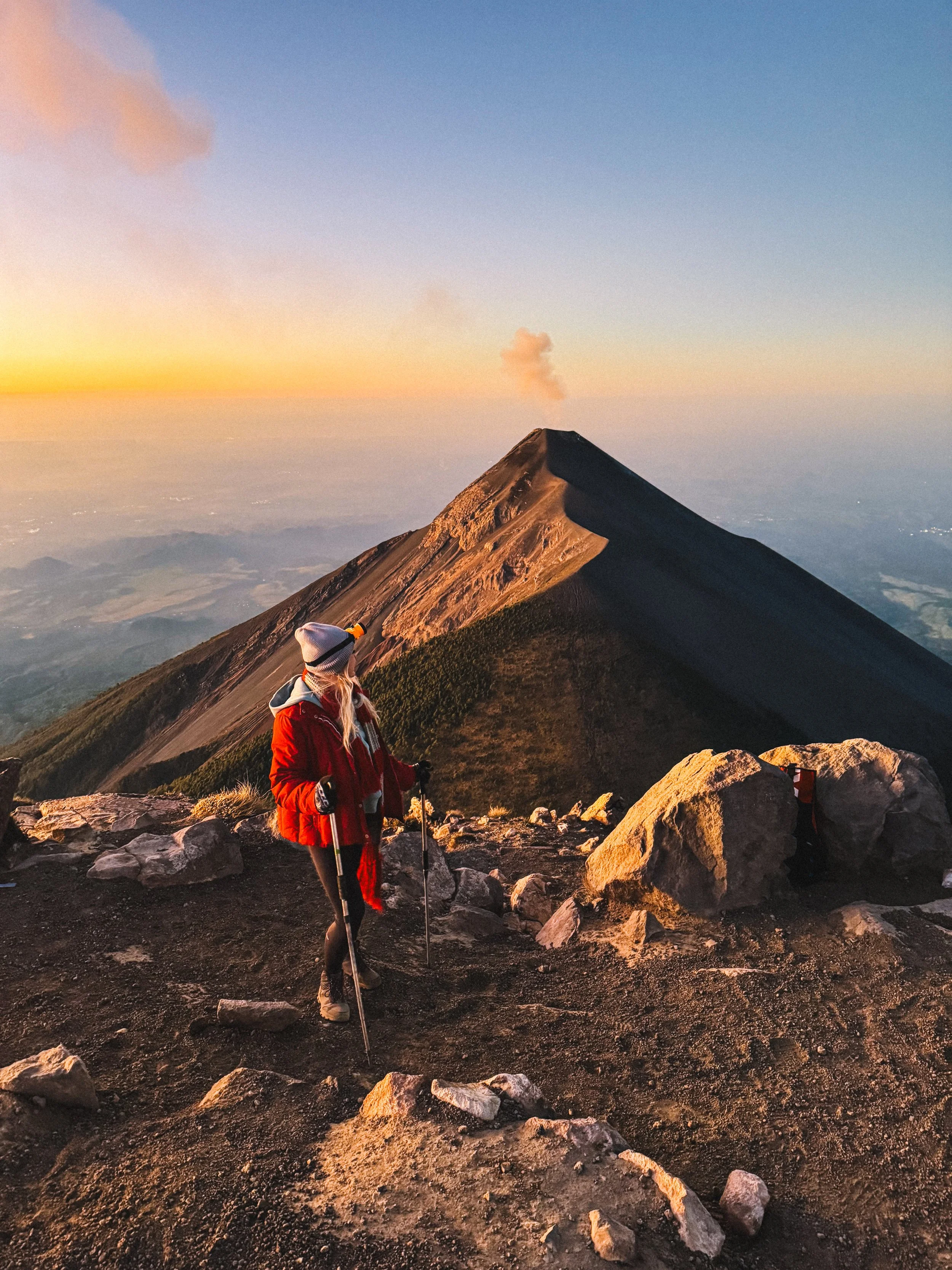 We summited just as the sun crept over the horizon, and the view was unlike anything I’d ever seen. Acatenango cast a literal shadow over the landscape below us, the the colors were otherworldly. Georgia and I had just popped a squat, huddling together for warmth and marveling over our accomplishment, when Fuego erupted yet again. I thought we couldn’t beat the nightime eruptions, as the lava is only visible in the pitch black, but this eruption against the pastel colors of the sunrise might just have become my favorite.